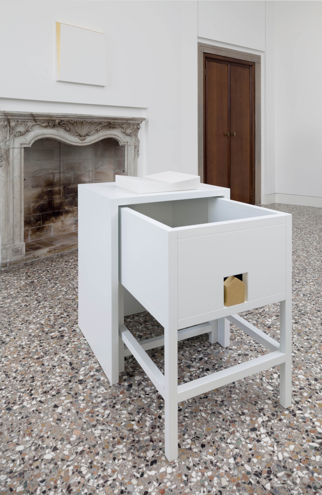 2011, impasto di colore su alabastro, legno laccato, foglia oro, velluto/color impasto on alabaster, varnished wood, gold foil, velvet - 3 elementi/3 elements, alabastro/alabaster 5 x 30 x 30 cm, scrittoio/writing desk 74 x 52 x 58 cm,sedia/chair 70 x 50 x 50 cm