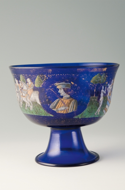 Vetro soffiato blu dipinto in smalti policromi e oro, con due medaglioni incornicianti due busti, uno femminile e uno maschile, tra due scene, la cavalcata e il bagno alla fontana dell’amore o della giovinezza