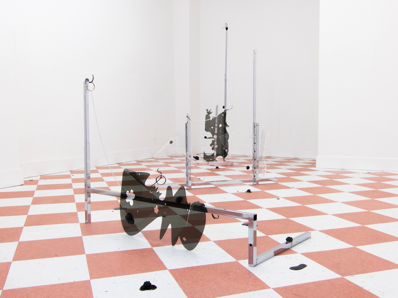 piastrelle in linoleum, rastrelliera cromata riciclata, plexiglass, resina, smalti, guarnizioni ad anello in nickel, catene, gesso, smalto per unghie, dimensioni variabili