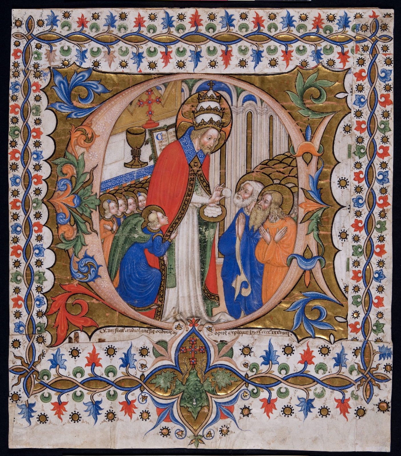 Maestro Olivetano (Frate/Fra Girolamo da Milano) (attivo in Lombardia nella prima metà del XV secolo), Iniziale ritagliata da Graduale temporale con Celebrazione del Corpus Domini o Comunione degli apostoli in iniziale C, 1439. Venezia, Fondazione Giorgio Cini