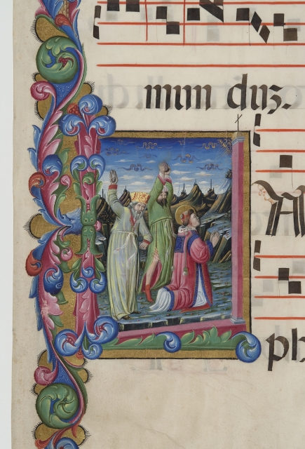 Franco dei Russi (Mantova, attivo tra il 1455 e il 1482 a Ferrara, Padova, Venezia e Urbino), Foglio staccato da Antifonario con Lapidazione di santo Stefano in iniziale L, settimo decennio del XV secolo. Venezia, Fondazione Giorgio Cini